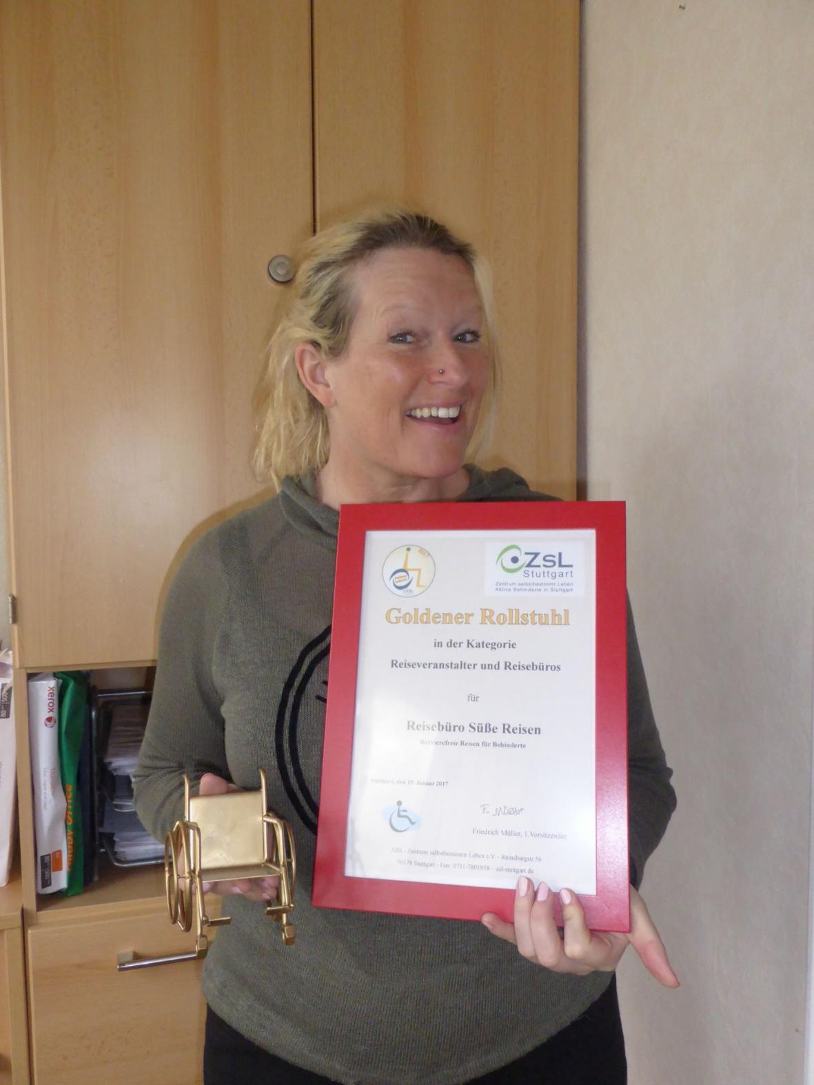 Anlässlich der Touristikmesse CMT in Stuttgart im Januar 2017 wurde mir vom ZSL der "Goldene Rollstuhl" verliehen. Der Preis wurde mir für besonderes Engagement für die Vermittlung "barrierefreien Reiseziele" vergeben. Ich habe mich sehr über diese Auszeichnung gefreut!! Leider konnte ich den Preis nicht persönlich in Stuttgart an diesem Tag auf der Messe entgegen nehmen.