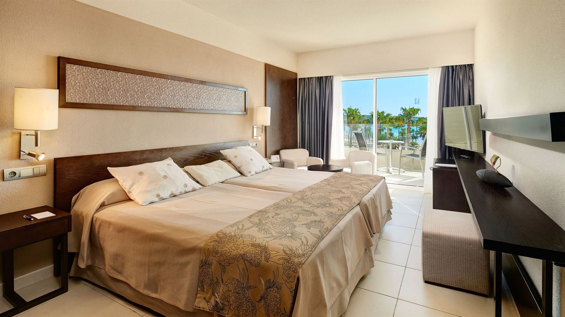 Das Hotel bietet sehr gut ausgestattete Doppelzimmer mit Meerblick für Rollstuhlfahrer an. Das Badezimmer ist entsprechend barrierefrei gestaltet.