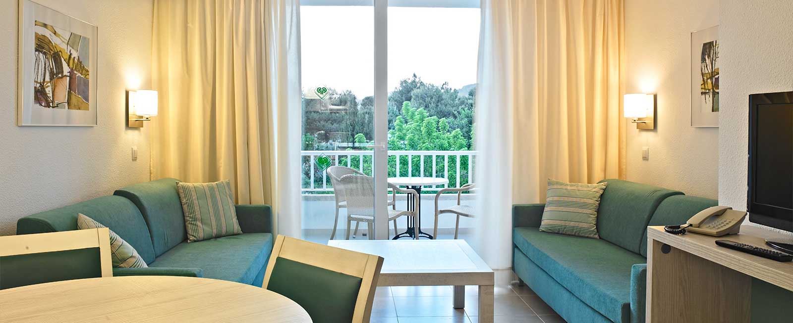 Die Appartements mit 1 Schlafzimmer, separates Wohnzimmer, Klimaanlage, Föhn, Minibar, Fernseher, SAT-TV, Telefon, Schlafsofa, Kochnische, Mikrowelle, Wasserkocher