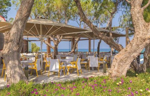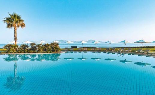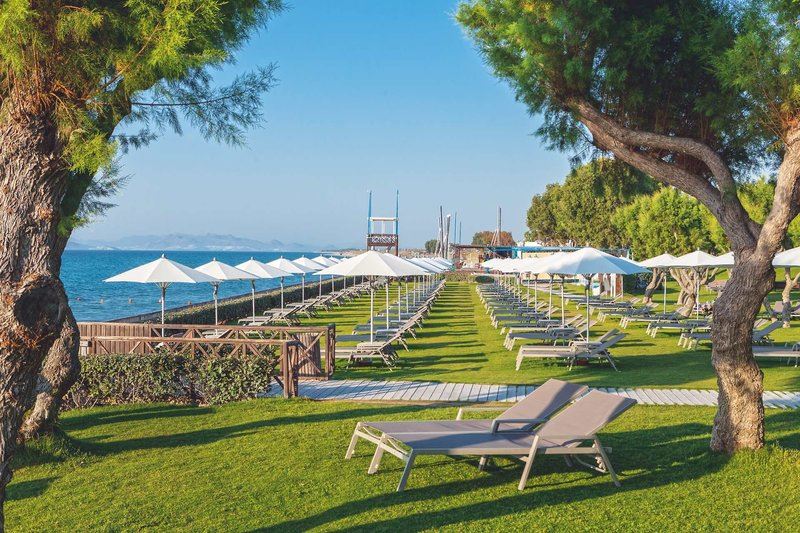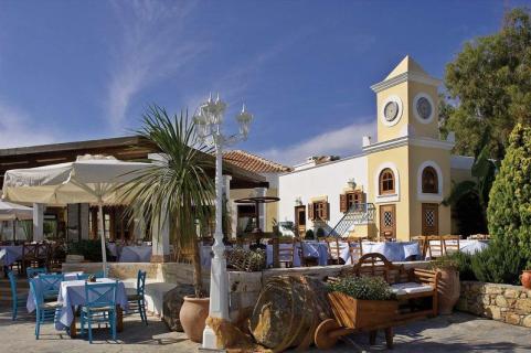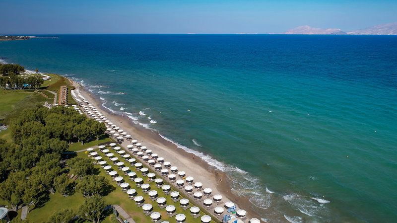 Die komfortable Anlage liegt in einer weitläufigen, gepflegten Gartenanlage, die sich bis an die Stranddünen erstreckt und einen fantastischen Blick auf die Insel Kalymnos bietet. Im Haupthaus befinden sich eine elegante Rezeptionshalle sowie die Lobbybar. Wi-Fi ist in der gesamten Anlage verfügbar (inklusive). Außerdem bietet dieser luxuriöse Ferienkomplex einen Speiseraum, zahlreiche Bars (teilweise mit traumhaftem Blick auf das Meer), Gelateria, Mini-Markt sowie eine Shoppingarkade mit Juwelier, Kleidungs-, Schuh- und Lederwarengeschäft, Souveniershop und Bankautomat. In den vier verschiedenen À-la-carte-Restaurants können Sie eine reichhaltige Auswahl an einheimischen und internationalen Gerichten genießen. Die gesamte Anlage verfügt über vier Swimmingpools (einer ist im April, Mai und Oktober beheizt), die gleichmäßig über das Areal verteilt sind sowie einen Whirlpool. Auf den Sonnenterrassen und am Strand stehen Liegen, Sonnenschirme und Badetücher zur Verfügung (inklusive). Dort befinden sich auch zwei Strandbars. Ein Mini-Wasserland bringt auch für die kleinen Gäste tollen Urlaubsspaß, während die Erwachsenen sich im luxuriösen Neptune Spa inklusive großzügigem Hallenbad, welches den gehobenen Komfort des Hauses widerspiegelt, rundum verwöhnen lassen können. Am Pool gibt es einen Lifter!