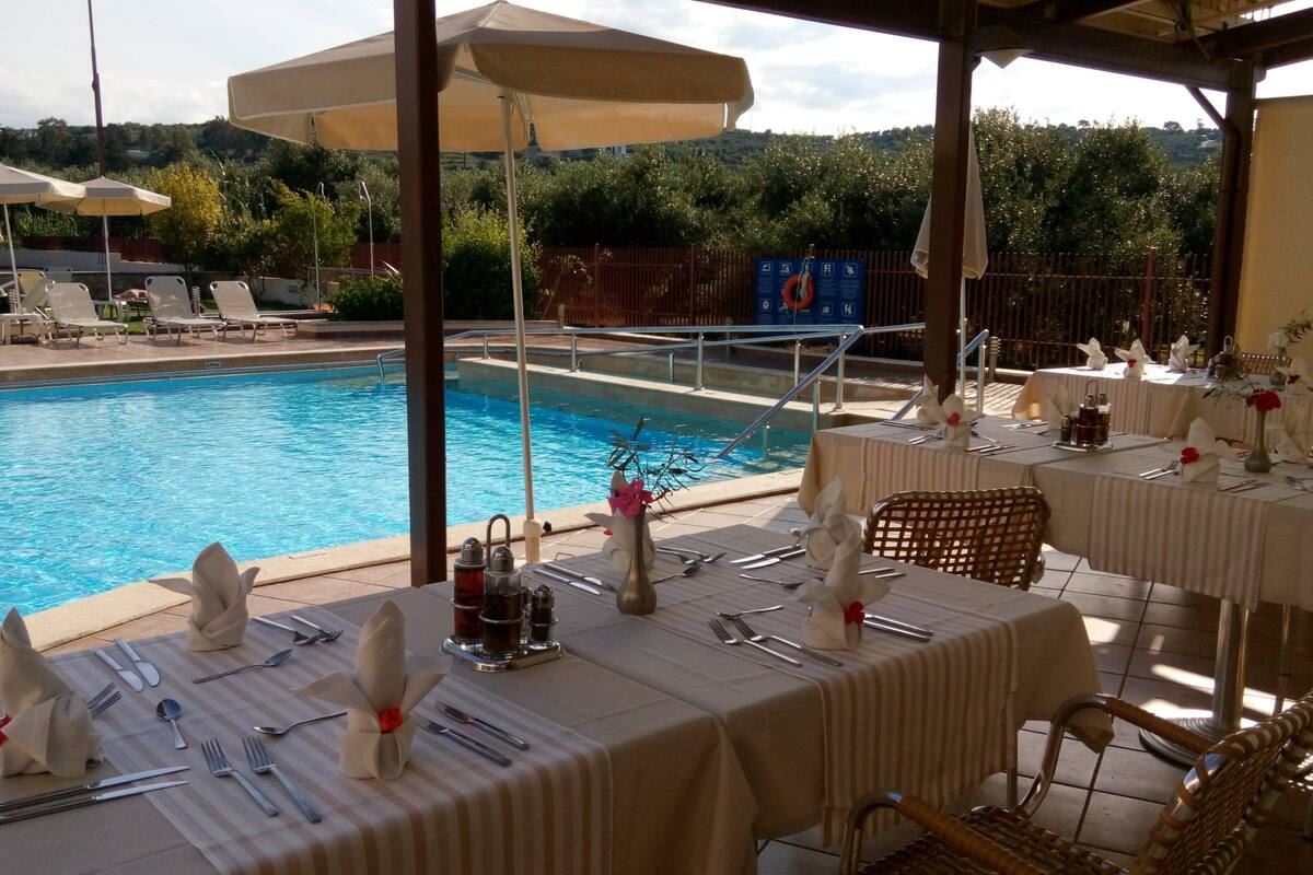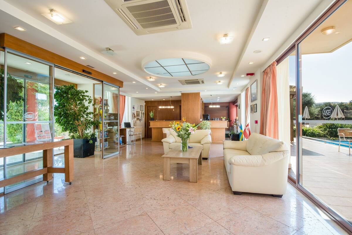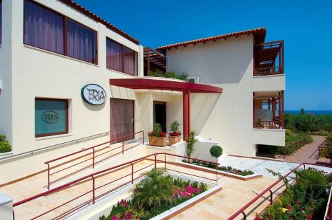 Lage: Die Anlage befindet sich im historischen Dorf Maleme im Westen von Kreta. In einer Gegend von einzigartiger Naturschönheit. Sie ist von Olivenhainen umgeben und bietet einen ungestörten Blick auf das Kretische Meer. Die Umgebung des Hotels ist sehr schön und mit Rollstuhl zugänglich, jedoch an einem kleinen Hang. Man kann bis ins Dorf spazieren oder durch die Olivenhaine schlendern.