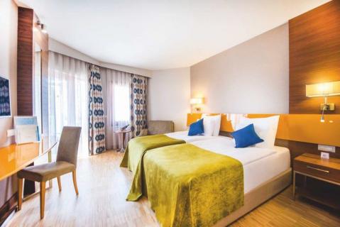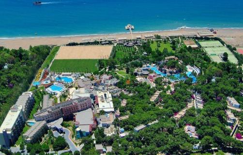 Ihr Feriendomizil für unbeschwerte Urlaubstage bietet Ihnen insgesamt 671 Zimmer, die sich auf den Clubbereich mit mehreren zweigeschossigen Clubgebäuden, den modernen Hotelbereich auf fünf Etagen und das zum Haupthaus gehörende elegante Superiorgebäude verteilen. Eine großzügige Empfangshalle mit Rezeption, Aufzügen, gemütlichen Sitzgruppen und Lobbybar heißt Sie herzlich Willkommen. Für Ihr leibliches Wohl stehen Ihnen im Sommer zwei Hauptrestaurants mit Terrasse, die beiden Spezialitätenrestaurants, Türkische und Österreichische, die Snackstation und diverse Bars zur Verfügung. Des weiteren bieten Internetcafé und Wi-Fi, Spaß und Unterhaltung. Zur Verfügung stehen auch ein Minimarkt, verschiedene Geschäfte, der Friseur, das lichtdurchflutete Hallenbad mit Kinderbecken und das moderne Wellness-Centrum. Im schön gestalteten Garten mit altem Baumbestand finden Sie im Sommer das Amphitheater für die Abendveranstaltungen, im Clubbereich einen Süßwasser-Swimmmingpool mit zwei sowie einen separaten Kinderpool mit Wasserrutschen, im Hotelbereich stehen außerdem ein halbolympischer Pool, ein weiterer Pool mit Jacuzzi und einer mit vier Wasserrutschen sowie ein separater Kinderpool ebenfalls mit Wasserrutschen, dazu die Sonnenterrassen, Pool-Snackbar und den tollen Badesteg. Rund um die Pools, auf dem Steg und am Strand sind Liegen, Auflagen, Sonnenschirme/Dächer und Badetücher inklusive.
