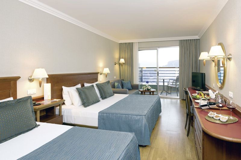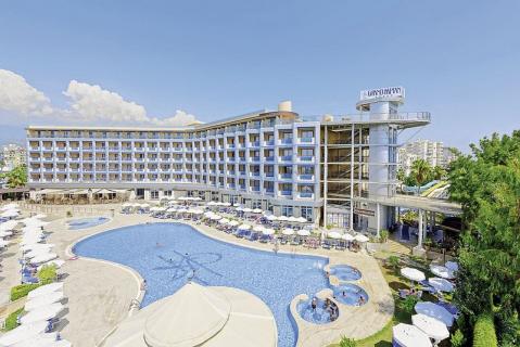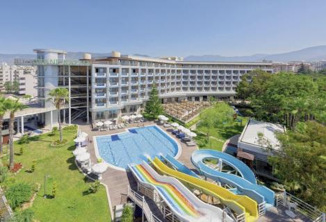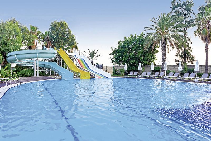 Das bekannte Urlaubshotel mit vielen Stammgästen verfügt über insgesamt 334 Zimmer (Lifts vorhanden). Im Hotelgebäude befinden sich die elegante Empfangshalle mit Rezeption, Sitzecken und Lobbybar, der Sat.-TV Raum, Spielzimmer, Konferenzräume, Panorama-Buffetrestaurant mit Terrassenbereich sowie zwei À-la-carte-Restaurants, Souvenirshop und Minimarkt. Im Lobbybereich steht Ihnen Wi-Fi zur Verfügung, in den Zimmern und anderen Bereichen des Hotels ist Wi-Fi gegen Gebühr. In der gepflegten Gartenanlage stehen Ihnen zwei Süßwasser-Swimmingpools, einer davon mit integriertem Kinderbecken und drei Wasserrutschen, ein separates Kinderbecken, die Sonnenterrasse, eine Pool-/Snackbar und Beachbar zur Verfügung. Liegen, Auflagen, Strandhandtücher und Sonnenschirme sind hier genauso wie am Strand für unsere Gäste inklusive. Am Pool gibt es einen Lifter!