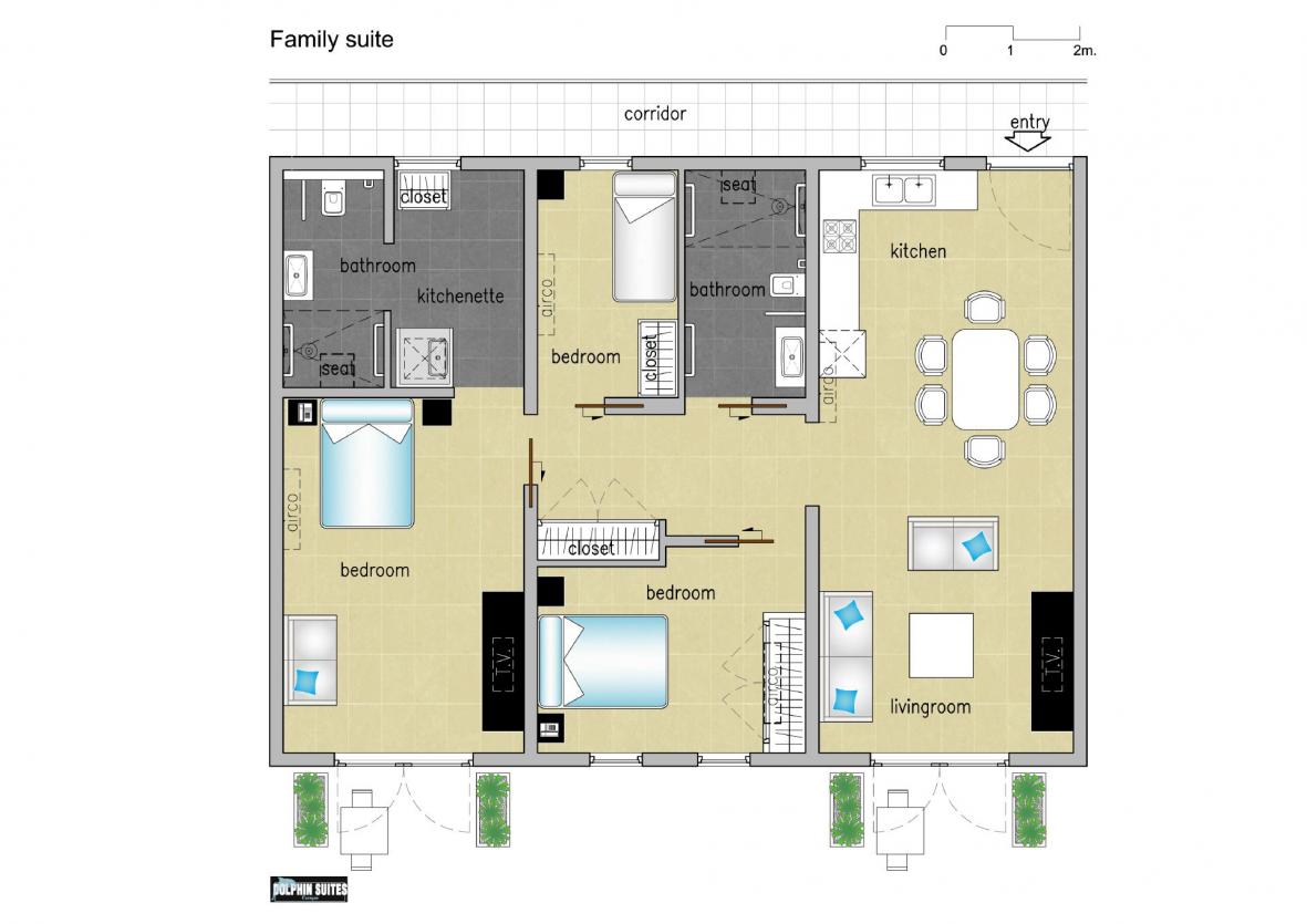 Die Familien Suite kombiniert ein Standard-Zimmer mit einer Suite und ist für 5 Personen, maximal 6 Personen geeignet. Die Unterkunft bietet 3 Schlafzimmer, von denen zwei Schlafzimmer ein queensize Bett haben und das dritte Schlafzimmer ein Einzelbett. Weiterhin sind 2 Badezimmer, eine Kitchenette, als Teil des Doppelzimmers, und eine komplett ausgestatte Küche vorhanden. Die Unterkunft hat überall Klimaanlage. Sonst gleich wie die Suiten ausgestattet.