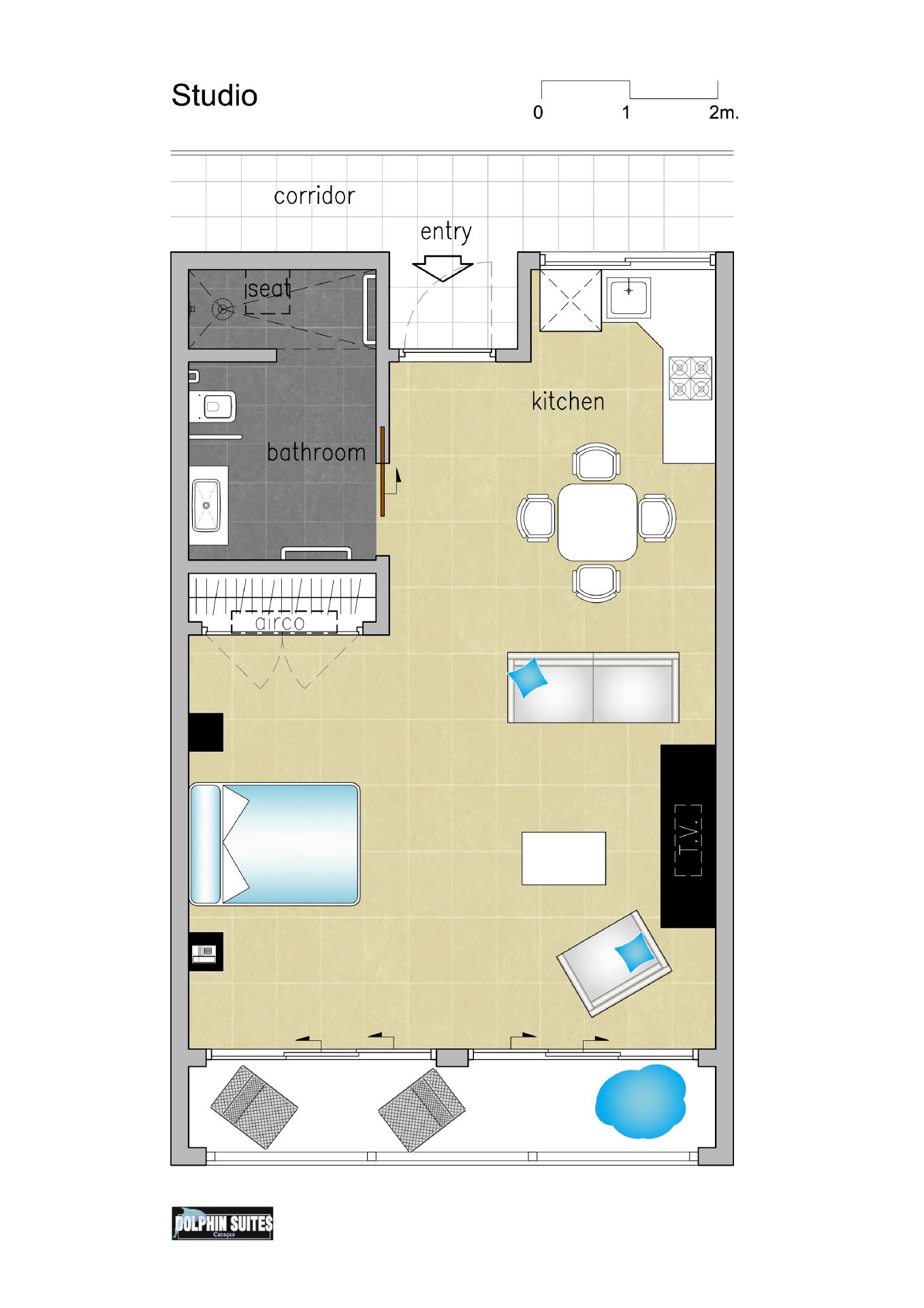 Das einzige Studio mit seiner kathedralenähnlichen Decke und dem Blick auf das Meer ist extravagant sowohl was Geräumigkeit wie auch das Design betrifft. Darin sind Schlafzimmer, Küche und Wohnzimmer kombiniert. Das Studio ist für 2, maximal 3 Personen geeignet und verfügt über Klimaanlage, Badezimmer mit extra Haltegriffen und Sitz in der Dusche, Doppelbett, Kabelfernsehen, Direktwahl-Telefon, Internetanschluss und Deckenventilator, Wohnzimmer mit Schlafcouch, vollständig eingerichtete Küche mit Mikrowelle/Ofen, Kühlschrank, Kaffeemaschine, Herd und Spülmaschine, Balkon mit Blick auf die umgebenden Resorts und das Meer