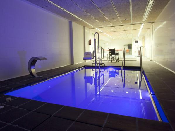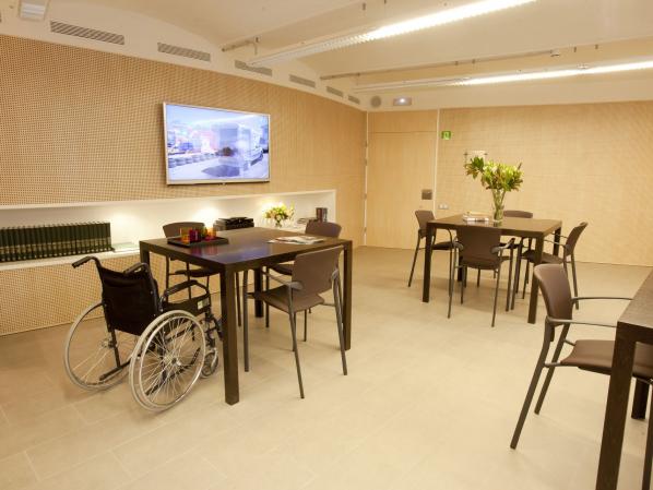 große Terrasse mit angeschlossenem Restaurant mit Bar, Mehrzweckraum mit TV und WiFi, Therapiemöglichkeiten in einem extra dafür ausgestatteten Therapieraum mit Therapie Pool mit Pool-Lifter, 24-Std. Notrufbereitschaft. Für Selbstanreisende gibt es Parkmöglichkeiten