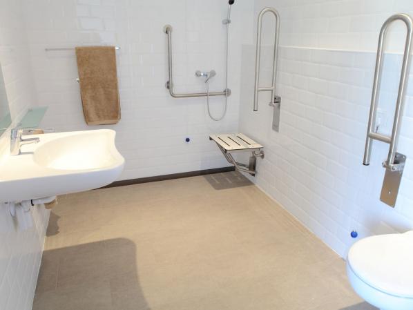 Das Hotel bietet rollstuhlgeeignete Doppelzimmer an. Das Badezimmer ist entsprechend barrierefrei gestaltet.